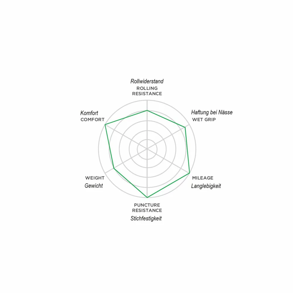 - Hochdicht gewellter Gürtel aus Aramidfasern unter der Lauffläche, der Schutz gegen durchstechende und scharfe Fremdkörper bietet.
